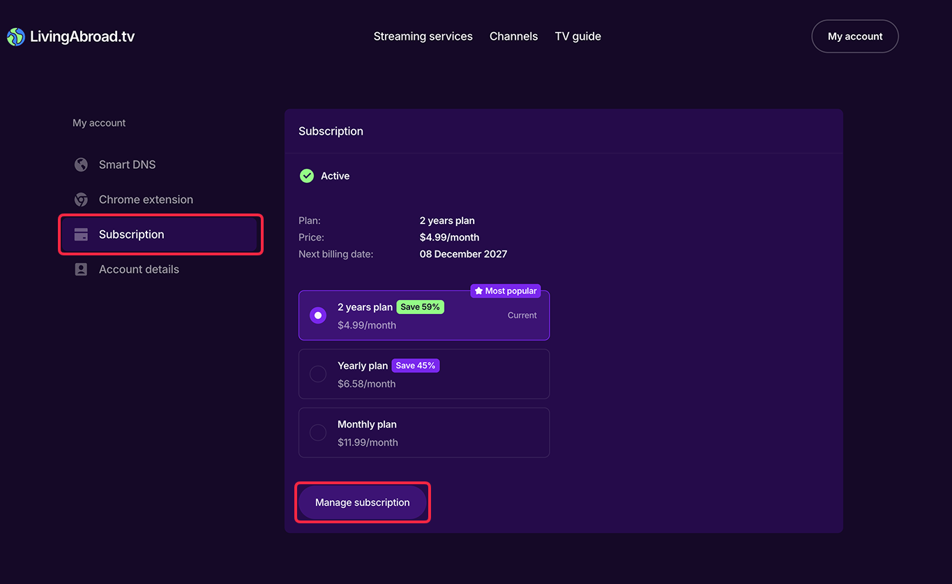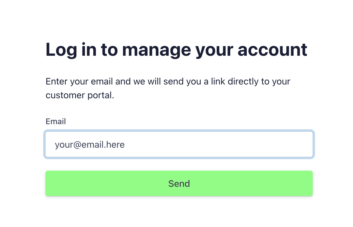Check your email. Stripe will send you a link to your Stripe Customer portal where you can update your payment method, credentials, subscription plan and view transactions history.