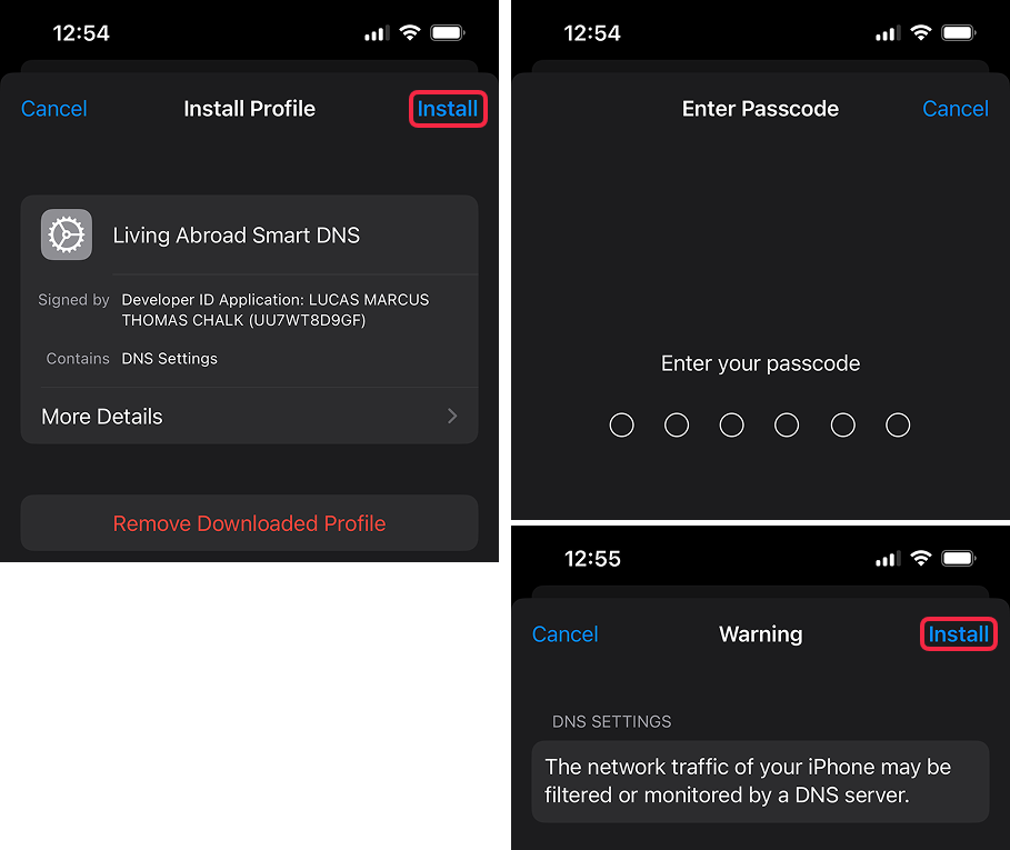 In the pop up window press Install in the top right, enter your passcode and press Install again during the warning. Do not worry, our service does not analyse your network traffic, it only routes requests to streaming platforms.