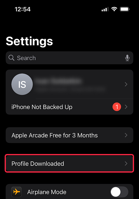Next, visit the Settings app and press the new Profile Downloaded button below your name/account profile picture.
