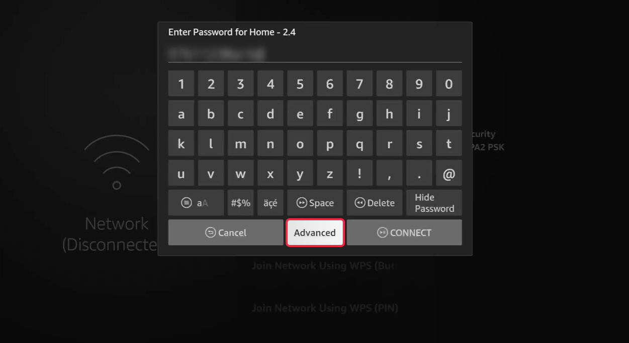 Now select the same Wi-Fi network again and enter your password. Do not press CONNECT, instead press Advanced.