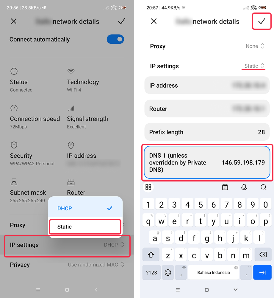Scroll down to DNS 1, tap on the field, type in 146.59.198.179 and hit Enter (⏎ ).