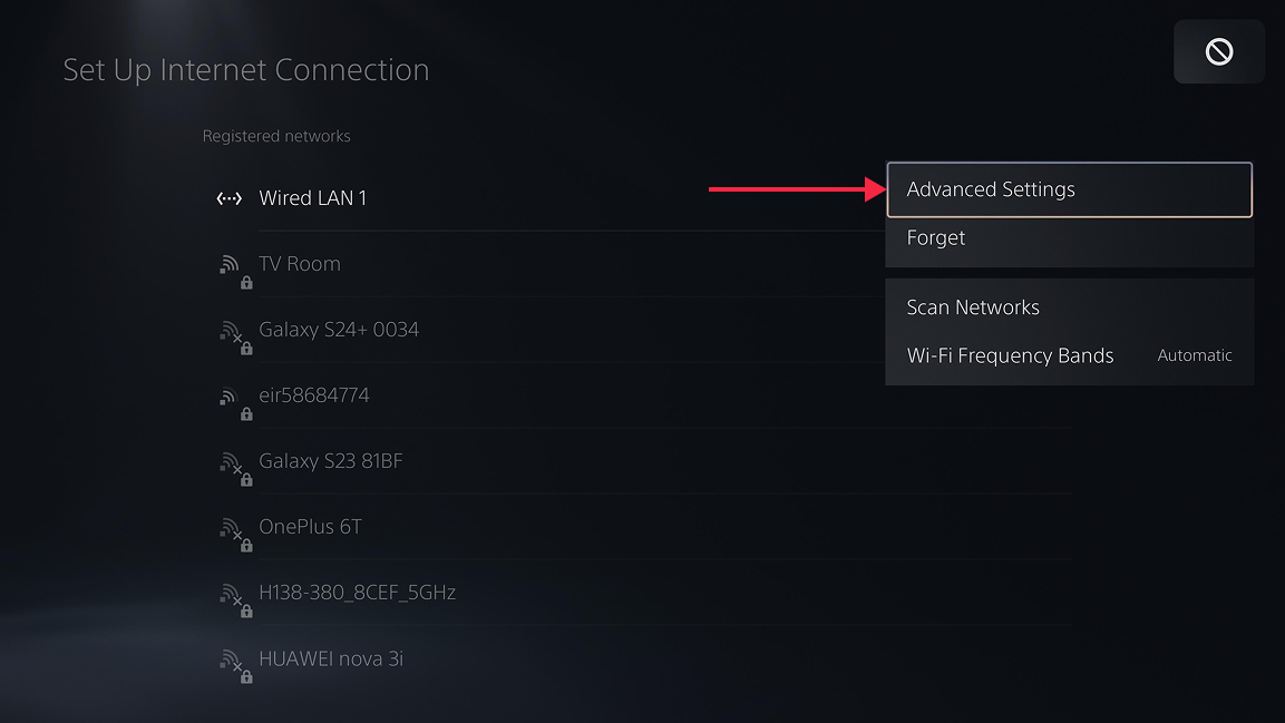- Select your active internet connection (can be wired or Wi-Fi) and then Advanced Settings.