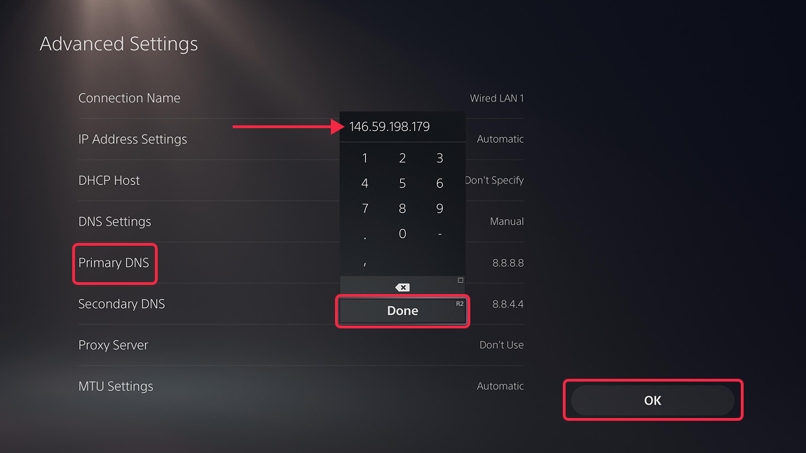 146.59.198.179. Press Done (R2), then OK at the bottom right.